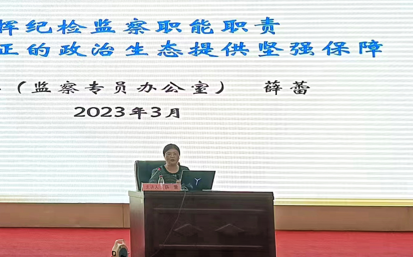 学校监察专员办公室副主任薛蕾作了题为《发挥纪检监察职能职责为风清气正的政治生态提供坚强保障》的专题培训。围绕当前反腐败斗争形式对信访举报和问题线索处置流程进行了详细解读。