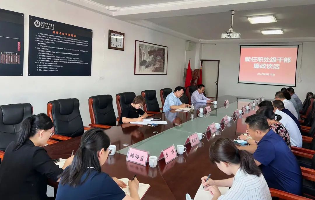 9月13日,学校党委委员、纪委书记、自治区监委驻内蒙古医科大学监察专员苏振荣对学校新任职的12名处级干部开展集体廉政谈话。谈话由学校纪委副书记(监察专员办公室主任)刘玉龙主持。