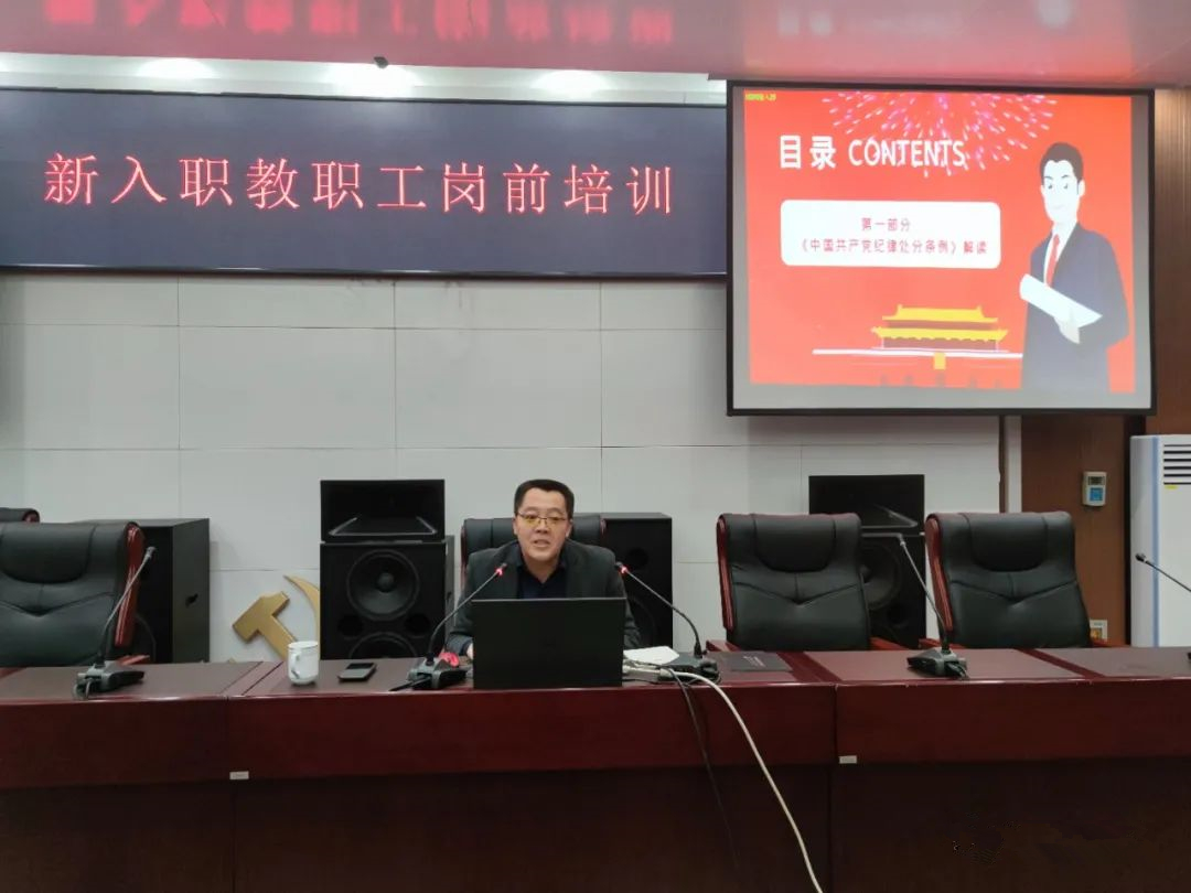 学校纪委(监察专员办公室)副处长郭峰同志为新入职员工讲解了党纪法规,重点对《中国共产党纪律处分条例》《公职人员政务处分法》有关内容进行了解读;同时根据目前全国高校反腐败形势,对典型案例进行了通报。