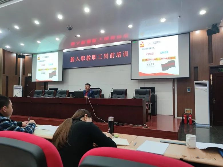 学校纪委(监察专员办公室)科长跟锁同志作了题为《发挥纪检监察职能职责——为风清气正的政治生态提供坚强保障》的专题培训。以纪检监察职能职责为主线,“四种形态”为基础,从监督、执纪、问责三个方面进行了全面的讲解,并向新入职员工详细介绍了监督执纪问责的工作流程。