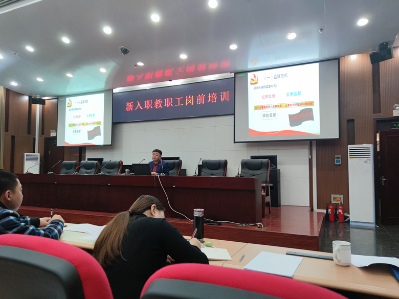 为进一步增强学校新入职员工纪律规意识,提高拒腐防变能力,打好岗前廉洁从业“预防针”。10月22日,在2020年新入职员工岗前培训班上,学校纪委(监察专员办公室)紧盯从业“起跑线”,对新入职的141名教职工开展了题为《严守职业底线 坚持廉洁从业》的岗前廉洁专题教育培训,切实引导新入职员工知敬畏、存戒惧、明底线,从思想上筑牢廉洁自律的第一道防线。
