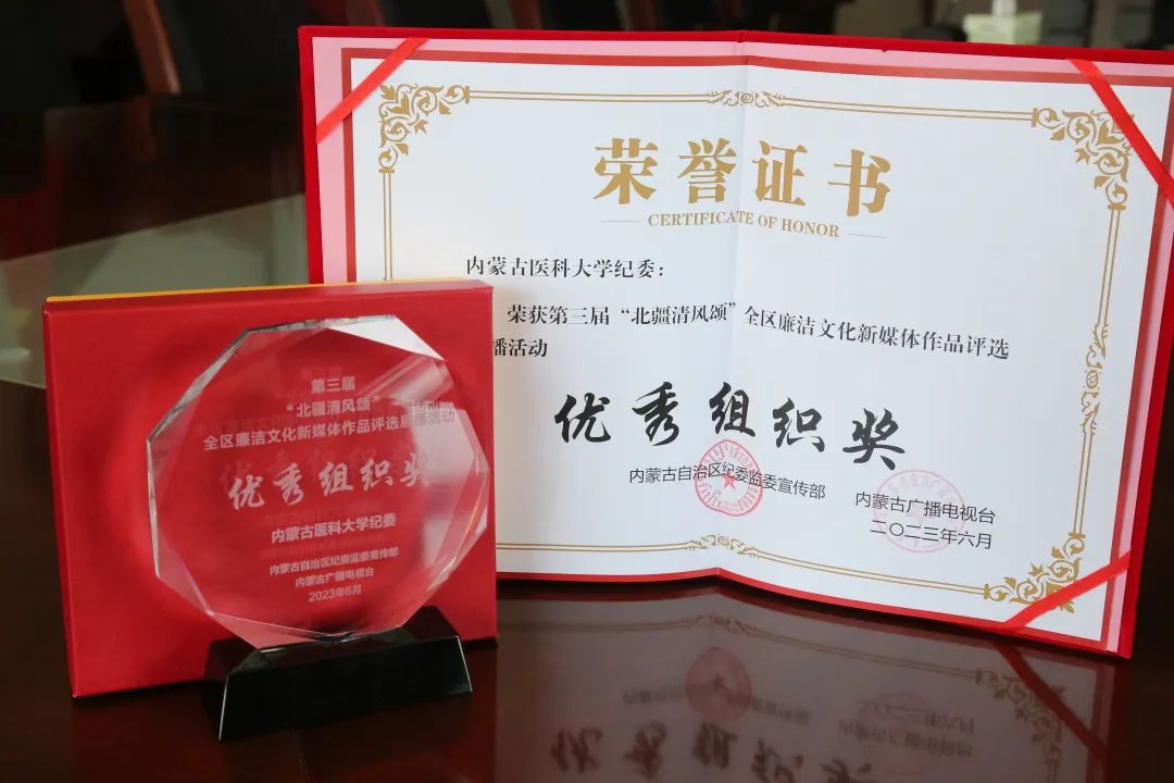 近日,内蒙古自治区纪委监委对第三届“北疆清风颂”全区新媒体廉政作品评选展播活动中获奖的优秀组织单位和优秀作品进行了表彰。在全区各盟市、旗县、国企、高校、派驻纪检监察组等众多参评单位中,我校纪委成为10个优秀组织奖的获奖单位之一。
